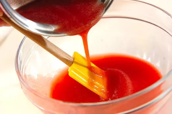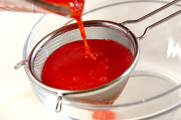 2、イチゴはヘタを取って水洗いし、水気を拭いてミキサーにかける。なめらかになったらこし器でこしてボウルに入れ、200gを計量する。