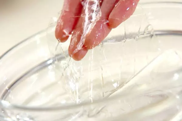 1、板ゼラチンを分量外の氷水に入れ、もどす。
