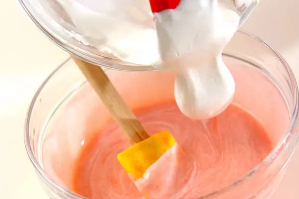 5、生クリームを氷水にあて、7分立てに泡立てる。(4)に2回に分けて加え、その都度混ぜる。