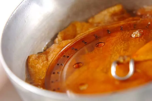 1、鍋に<油揚げ用煮汁>の材料と水気を絞った油揚げを入れ、弱めの中火にかける。落とし蓋をして煮汁がほとんどなくなったら、火を止めてそのまま冷ます。
