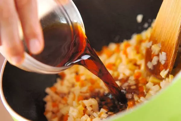 2、鍋にサラダ油を熱し、水きりしたレンコン、ゴボウ、ニンジン、タケノコを炒め合わせる。<具の合わせだし>の材料を加え、汁気がなくなるまで煮て冷ましておく。