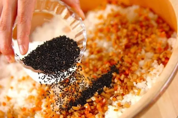 3、ご飯が炊き上がったら昆布を取り出し、飯台に作り置き甘酢を大さじ1~2入れて全体にぬるように広げ、炊き上がったご飯をあける。甘酢を全体にまわしかけ、切るように混ぜ、人肌位の温かさまで冷ます。冷めたら、(2)の煮た具、黒ゴマを混ぜ合わせる。