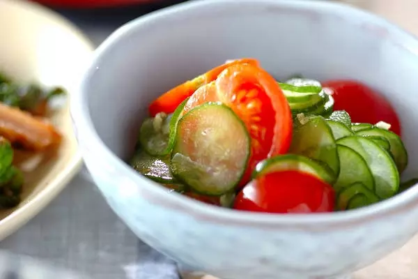 キュウリとプチトマトを甘酢で和えた、サッパリいただける一品。箸休めにもぴったりです。
