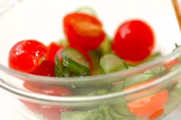 1、<調味料>のボウルにキュウリ、プチトマトを加えて和え、器に盛る。