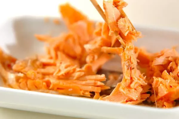 ・鮭は耐熱容器にのせてラップをかけ、電子レンジで2~3分加熱し、皮と骨を取り除いてほぐす。電子レンジは600Wを使用しています。
