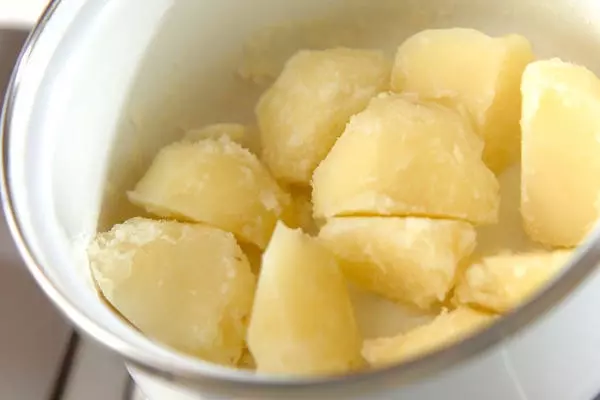 1、鍋にジャガイモと分量外のかぶる位の水を加え、強火にかける。煮たったらジャガイモが柔らかくなるまで約10分ゆでる。ゆで汁を捨てて強火にかけ、鍋を揺すりながら水分を飛ばす。