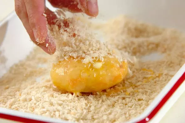 3、小判状にまとめ、<衣>の小麦粉、溶き卵、パン粉を順につける。