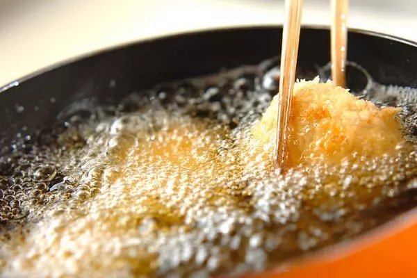 4、170℃の揚げ油に(3)を入れ、色よくサクッと揚げる。器に盛ってレタスとプチトマトを添え、お好みでウスターソースをかける。