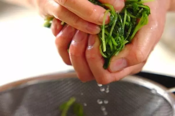 1、分量外の塩を入れた熱湯で豆苗をサッとゆで、冷水に取って水気を絞る。