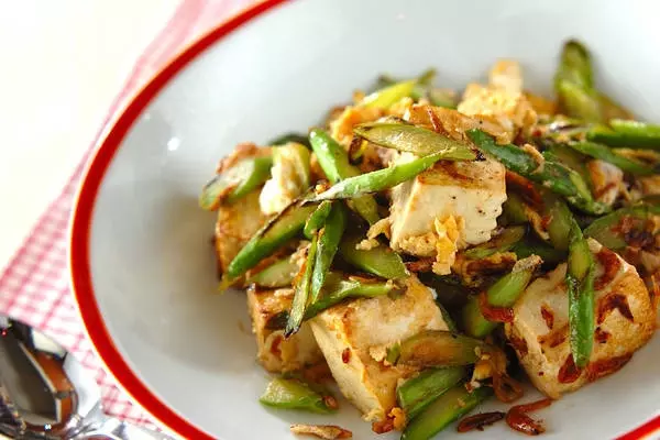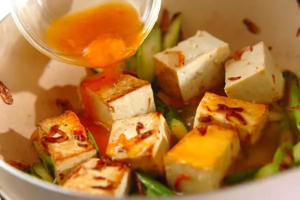 2、フライパンにゴマ油をひいて火にかけ、グリーンアスパラと干し桜エビを炒め、火が通ったら木綿豆腐を加えて炒め合わせる。全体に炒められたら卵をまわし入れ、半熟状になったら火を止め、塩コショウで味を調えて器に盛る。