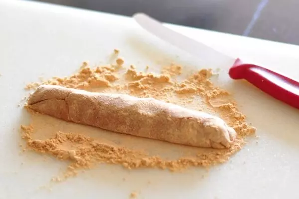 3、台にきなこで打ち粉をし、(2)を取り出して転がしながら棒状に成形する。