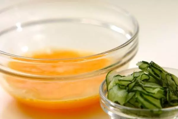1、キュウリは薄い輪切りにし、塩を振って5~6分おく。しんなりしたら水気を絞る。<錦糸卵>の材料を混ぜ合わせる。