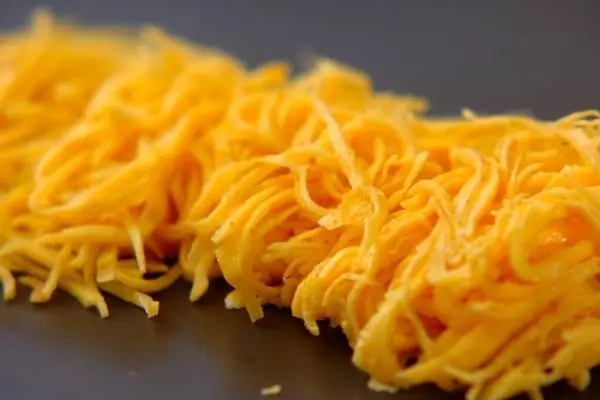 2、フライパンにサラダ油を中火で温め、<錦糸卵>の材料を流し入れて、薄焼き卵を作る。冷めたら細切りにする。