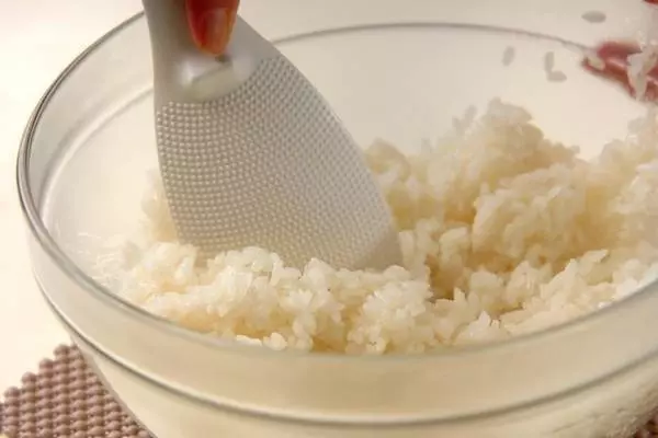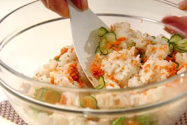 3、<すし飯>を作る。ボウルにご飯を入れ、作り置き甘酢をまわしかけ、しゃもじで切るように混ぜ合わせ、粗熱が取れたら白ゴマを混ぜる。