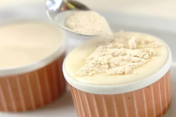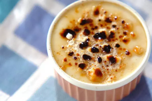 2、ココットに(1)を分け入れ、表面を平らにならす。メープルシュガーを振り、バーナーでおいしそうなキャラメル色になるまで焦がす。