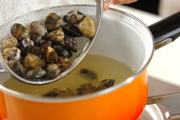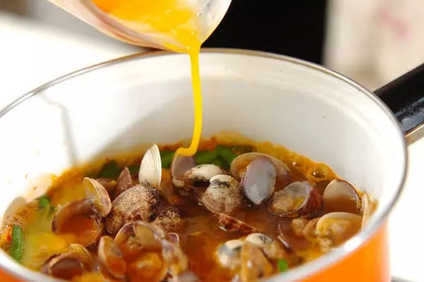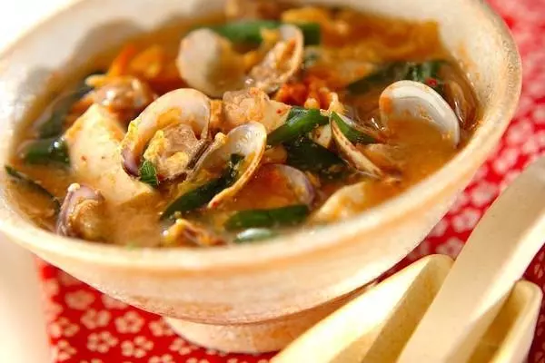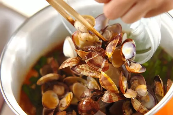 3、アサリの口が開いたらアクを取り除き、アサリをいったん取り出す。白菜キムチ、木綿豆腐、みりんを加え、再び煮たってきたらニラを加え、しんなりしたらアサリを戻し入れ、アサリが温まってきたら塩で味を調える。