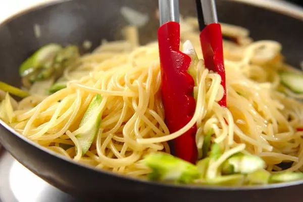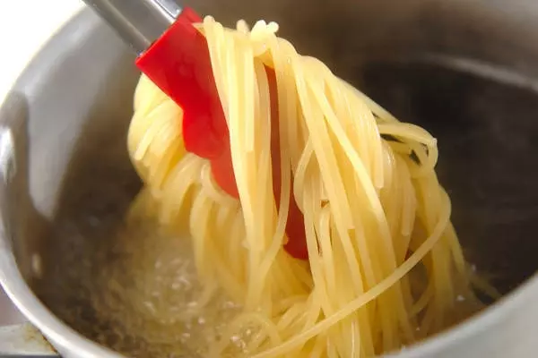 1、たっぷりの熱湯に塩を入れ、スパゲティーを加えて、袋の指定時間より1分短くゆでてザルに上げる。