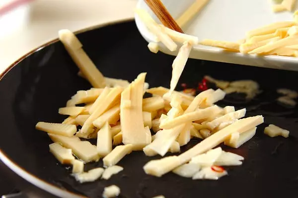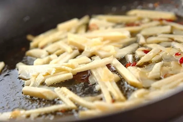 2、フライパンにオリーブ油、ニンニク、赤唐辛子を入れて弱めの中火にかける。香りがたってきたら水煮タケノコを加えて炒める。