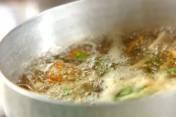 1、たっぷりの熱湯に塩を加え、新ゴボウ、サヤインゲン、ニンジンをゆでてザルに上げる。