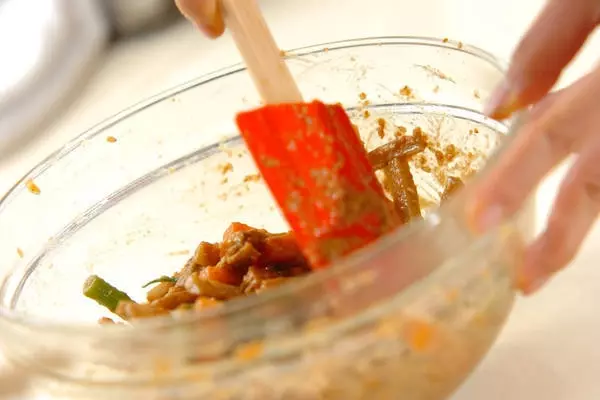 2、<合わせゴマダレ>の材料を混ぜ合わせ、熱々の(1)を加えて和え、器に盛り分ける。
