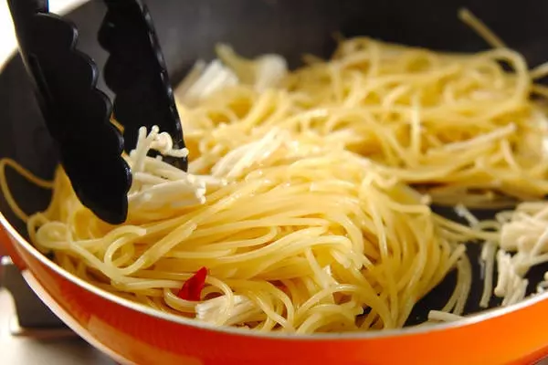 2、その間にフライパンにオリーブ油、ニンニクを入れて弱めの中火にかけ、香りがたったら赤唐辛子を加える。エノキ、ゆで汁をきったスパゲティーを加え、塩、粗びき黒コショウで味を調える。