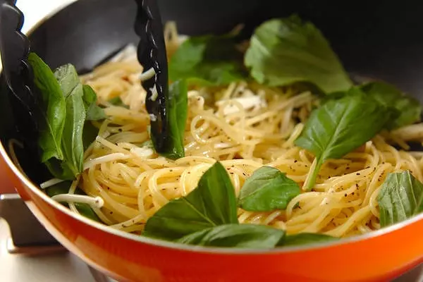 エノキとバジルを加えたペペロンチーノ。風味豊かな一皿に仕上がります。乾燥バジルのグリーンが目に鮮やか、そしてエノキは一年中手頃で手に入りやすい食材で、しかもヘルシー。いつでも気軽に作れるうれしい一皿です。