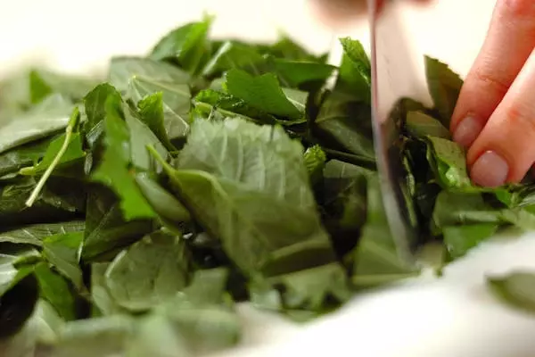 ・モロヘイヤは軸から葉だけを取り、サッと水洗いし、食べやすい大きさに刻む。