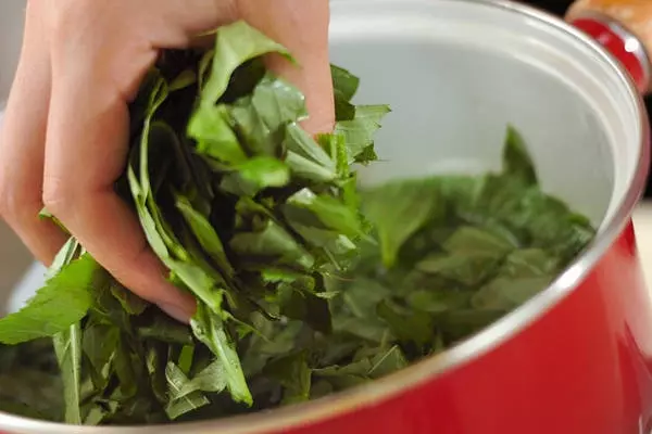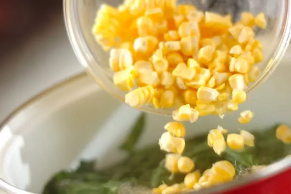 2、モロヘイヤがしんなりしたらトウモロコシを加えてひと混ぜし、火を止めて器に注ぐ。