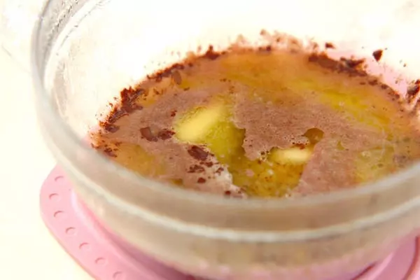 1、耐熱ボウルにチョコレート、バター、牛乳、砂糖を入れラップをかけ、電子レンジで2分加熱し溶かす。電子レンジは600Wを使用しています。