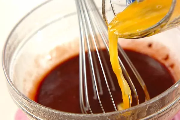 2、泡立て器で混ぜ合わせ、なめらかになったら溶き卵を加えて混ぜ合わせる。