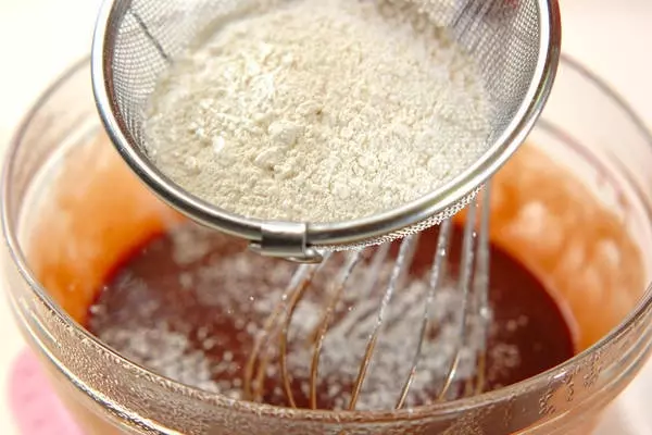 3、ホットケーキミックスを振るいながら加え、粉っぽさがなくなるまで混ぜ、ココットなどに入れる。