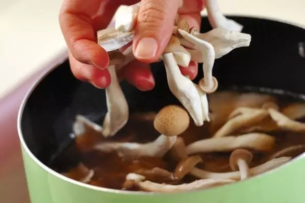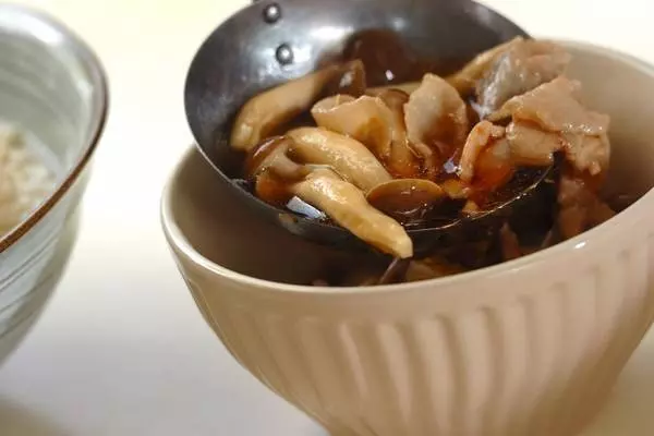 1、中火で熱した鍋にゴマ油をひき、豚バラ肉を軽く炒める。<つゆ>の材料、シメジを加えて煮る。