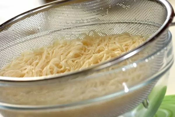 2、鍋にお湯を沸かし、素麺をゆでる。ゆで上がったら流水で洗って水気をきる。