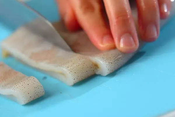 ・イカは足を持って胴から引き抜き、軟骨を取り除く。きれいに水洗いし、胴は幅1cmの輪切りに、足は目の際から切り落とす。くちばしを取り、足の長さを切り揃えて1本ずつに切り、白ワインをかける。