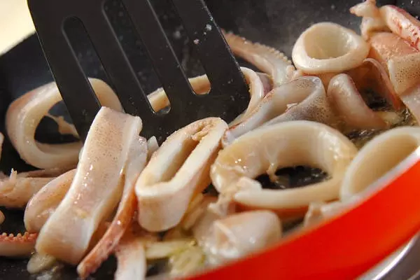 2、フライパンにオリーブ油、ニンニクを入れて中火で熱し、香りがたってきたらイカを炒める。