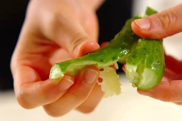 ・キュウリは端を切り落とし、すりこ木で軽くたたいて、割れたら食べやすい大きさにちぎる。