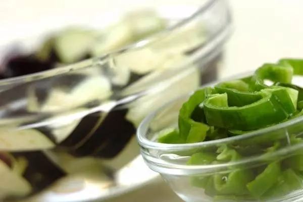 ・ナスはヘタを切り落とし、幅1cmの半月切り、またはイチョウ切りにし、水に10分放つ。ピーマンは縦半分に切ってヘタと種を取り、ナスの大きさに合わせて切る。