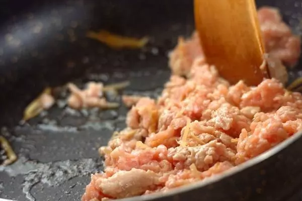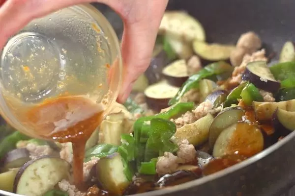 1、フライパンにゴマ油を入れ、中火でショウガを炒める。香りがたったら鶏ひき肉を加えて炒め、色が変わったら水気を拭き取ったナス、ピーマンを加える。