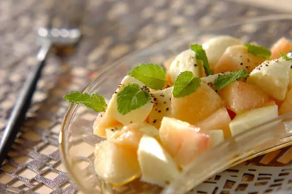 作り方はいたって、簡単! 桃とモッツァレラチーズを調味料と合わせて、ミントの葉を飾るだけ。桃のジューシーな甘さとクリーミーなモッツァレラのハーモニーが絶妙です。レモンの酸味が桃の甘みを引き出してくれます。ミントも相まって、後味爽やかで、今の時期にぴったりのサラダといえそうですね。