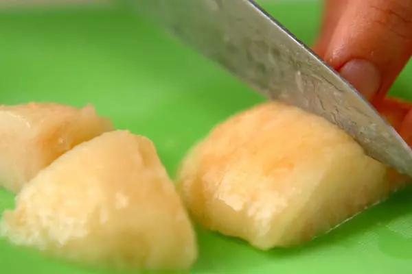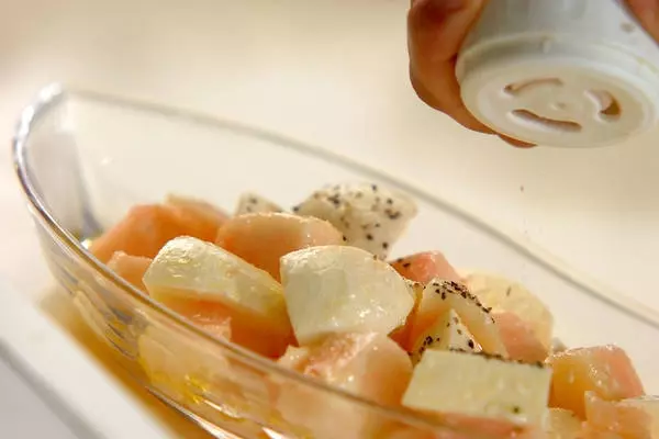 1、桃は皮をむき、ひとくち大に切る。モッツァレラチーズもひとくち大に切る。