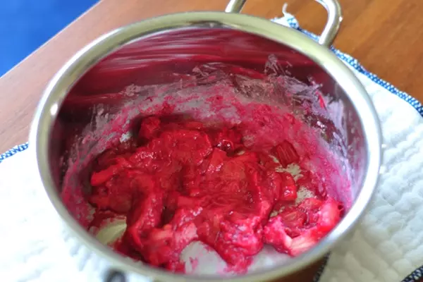 3、中火にかけ、混ぜながら加熱する。ルバーブが溶けだし、とろみがつけば完成。
