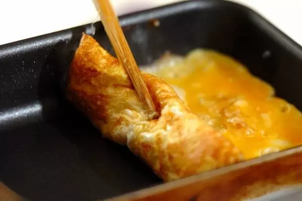 3、卵を向こう側に滑らせ、サラダ油を薄くひく。残りの半量を流し入れ、半熟になったら向こうから手前に巻く。同様にもう2度巻く。