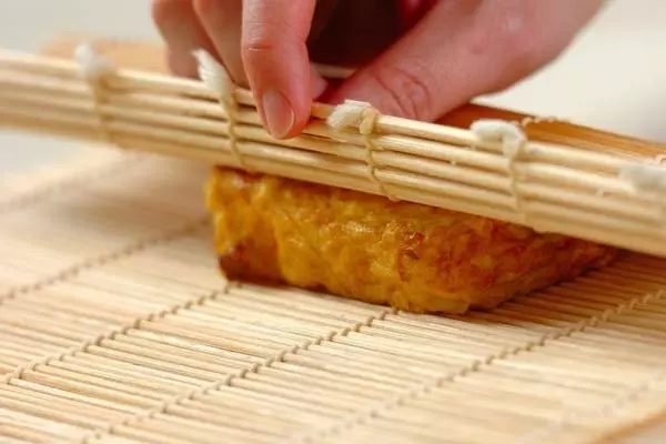 4、巻きすで巻いて形を整え、食べやすい大きさに切り、器に盛る。