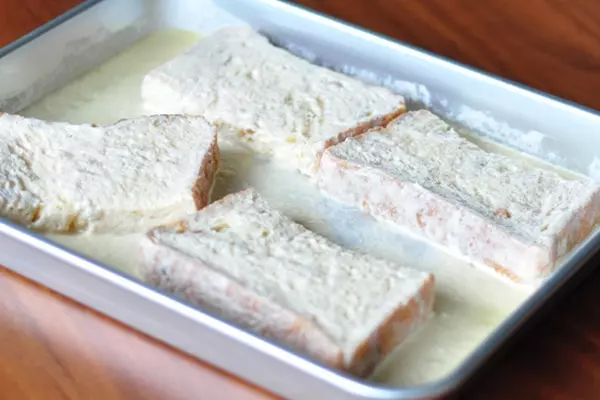 2、2等分に切った食パンを1に入れ、上下を返しながら10分ほど浸す(一晩浸してもOK)。