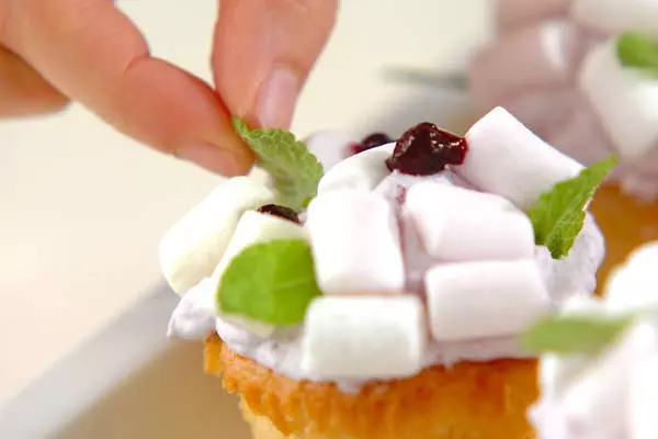 2、カップケーキに1をぬり、マシュマロを全体にのせる。空いた隙間に飾り用のブルーベリーの実をのせる。