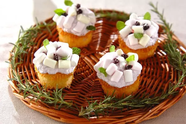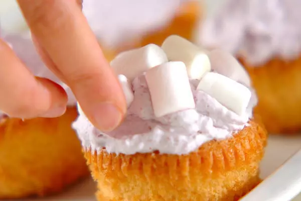 2、カップケーキに1をぬり、マシュマロを全体にのせる。空いた隙間に飾り用のブルーベリーの実をのせる。