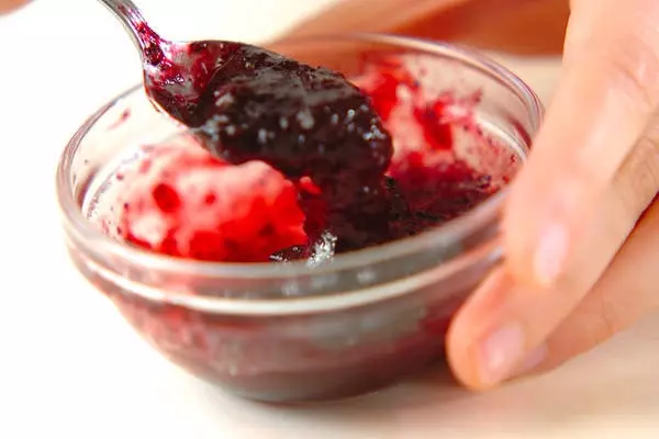 ・ブルーベリージャムにキルシュを加えて混ぜ、飾り用にブルーベリーの実だけ取り出しておく。