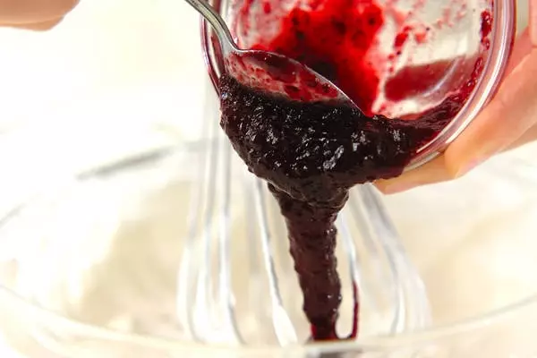 1、ボウルに生クリームを入れ、角が立つくらいしっかり泡立てたら、キルシュと合わせたブルーベリージャムを加えて混ぜ合わせる。