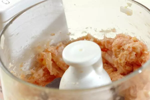1、<鶏団子>の鶏もも肉と白ネギはザク切りにし、全ての材料をフードプロセッサーにかけて肉ダネを作る。白菜キムチは長ければザク切りにする。白ネギは斜め薄切りにする。