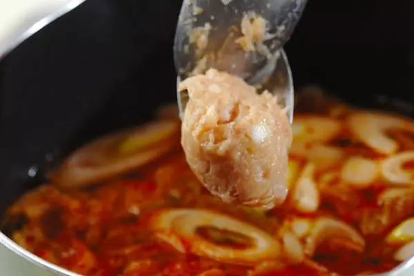 2、鍋に白菜キムチ、<スープ>の材料、白ネギを入れて火にかけ、煮たったら(1)の肉ダネをスプーンですくって落とし入れる。アクを取り、鍋に蓋をして弱火で煮る。